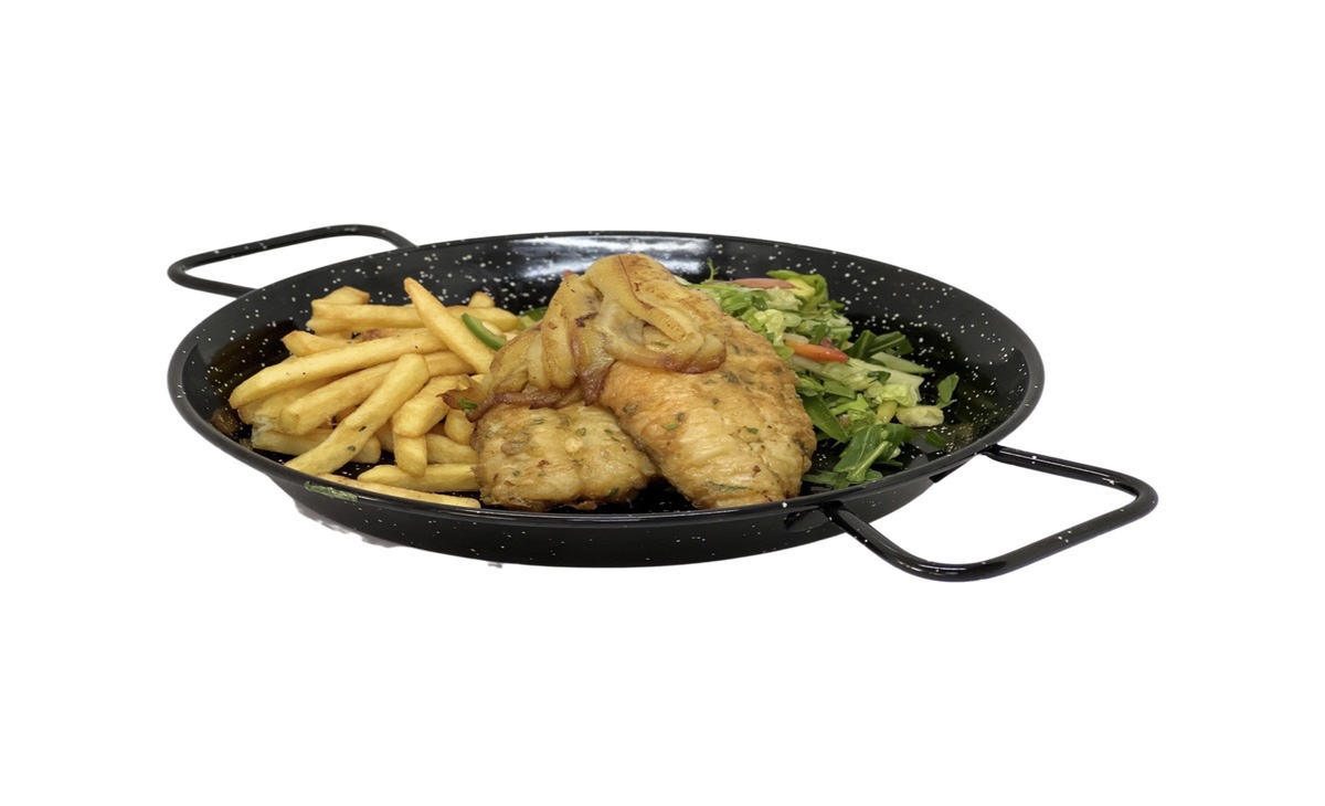Espada dourada com banana, legumes e batata padeiro